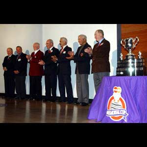 Seven Memorial Cup winners flank the original hallowed trophy during the press conference to unveil the Hockey Hall of Fame's newest Hartland Molson Theatre video "Memorial Cup Magic." (Friday, November 1, 2002 - Dave Sandford)