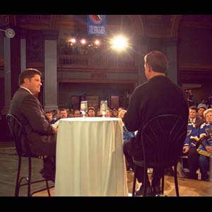 Gord Stellick (left) shares the stage with Bernie Federko as a large crowd participates in the 2002 Inductee Fan Forum. (Sunday, November 3, 2002 - Matthew Manor)