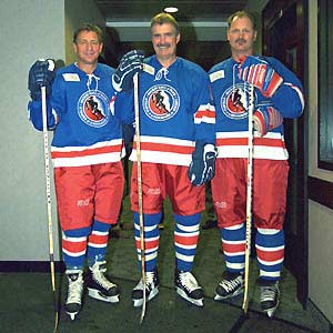 Hockey's newest player legends - Bernie Federko (right), Clark Gillies (centre) and Rod Langway (right) moments before taking the ice for the HHOF Legends Game.