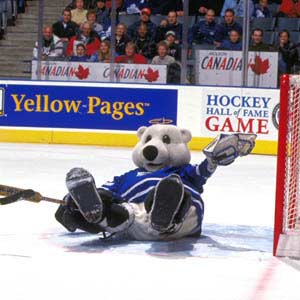 Toronto Maple Leafs' mascot Carlton the Bear gets beat on a penalty shot at the HHOF Legends Game. (Sunday, November 3, 2002 - Matthew Manor)