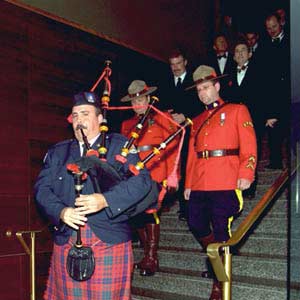 A bag piper and two representatives of the Royal Canadian Mounted Police lead a procession which features the Memorial Cup and the four newest members of the Hockey Hall of Fame. (Monday, November 4, 2002 - Dave Sandford)