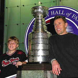 Maple Leafs icon Honoured Member Borje Salming and a young fan share the stage with the Stanley Cup. (Kodak Photo Day, November 1, 2003 - Mike Gouglas)