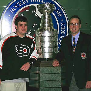 Philadelphia alumnus Honoured Member Dale Hawerchuk flanks the Stanley Cup with another Flyer fan.