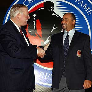 Hockey Hall of Fame Chairman Bill Hay (left) congratulates Grant Fuhr after providing him his official Honoured Member blazer. (November 3, 2003 - Dave Sandford)