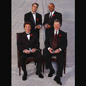2003 Inductees (left to right, front to back row) Pat LaFontaine, Grant Fuhr, Mike Ilitch, and Brian Kilrea each pose with a Hockey Hall of Fame puck. (November 3, 2003 - Dave Sandford)
