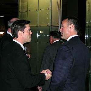 Honoured Member Pat LaFontaine (left) shares well wishes with Paul Coffey moments before Pat makes his Induction speech. (November 3, 2003)