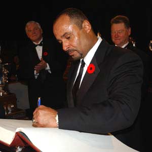 As per tradition, new inductee Grant Fuhr signs the Honoured Member book. (November 3, 2003)