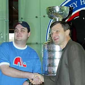 Honoured Member Peter Stastny joins a Quebec Nordiques fan next to the Stanley Cup. (November 6, 2004 - Dave Sandford)
