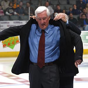 During the Legends Classic pre-game ceremonies, each of the 2004 Inductees were presented their official Hockey Hall of Fame blazers. Here, Cliff Fletcher tries on his blazer. (November 6, 2004 - Dave Sandford)