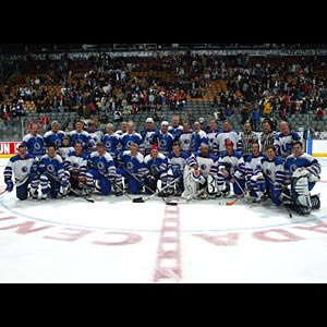 Both teams gather at centre ice to commemorate the occasion. (November 6, 2004 - Dave Sandford)