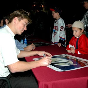 Meeting your hockey heroes is a thrill no matter how young or old you are, as witnessed by this young fan who looks on as Ruslan Fedotenko signs his poster. (4-Nov-05 Craig Campbell/HHOF)