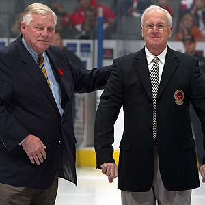 Hockey Hall of Fame chairman Bill Hay (left) greets longtime Hall of Fame board member and Hockey Canada president Murray Costello at centre ice prior to the Hockey Hall of Fame Legends Classic Game at Air Canada Centre Sunday afternoon.