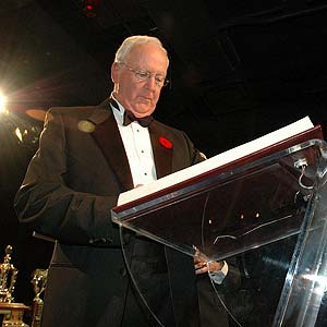 The final act of the Induction Ceremony Monday night was to sign the Honoured Members' book. Murray Costello, the pride of South Porcupine, Ontario, commits his name to paper, beaming with pride. (Scott Veber/HHOF)