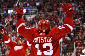 Pavel Datsyuk scores a goal in the 2008 Stanley Cup playoffs. (HHOF)