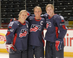 Team USA teammates Natalie Darwitz, Krissy Wendell and Gigi Marvin at the 2007 World Championships. (Matthew Manor/HHOF-IIHF)