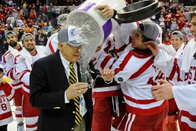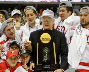 Jack Parker and the Boston University Terriers celebrate winning the 2009 NCAA Men’s Frozen Four Final. (Mitchell Layton | HHOF-IIHF)