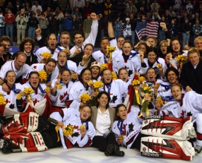 Canadian Women’s hockey team Danièle Sauvageau and the Canadian women's hockey team with their gold medal after defeating the United States 3 - 2 in Salt Lake City during the 2002 Winter Olympics. (HHOF-IIHF)
