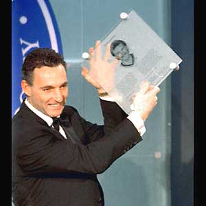 Denis Savard proudly shows off his Hall of Fame plaque (2000/HHOF - Dave Sandford)