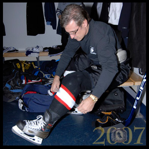 During the 1st intermission, 2007 Inductees Ron Francis, Al MacInnis, Mark Messier and Scott Stevens prepared for their first ever appearance in the Source For Sports Hockey Hall of Fame Legends Classic. (Graig Abel/HHOF/11Nov07)