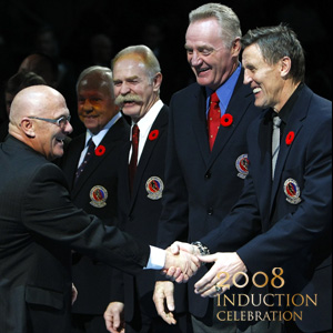 Ray Scapinello is welcomed by a procession of Honoured Members at the annual Hockey Hall of Fame Game featuring the Toronto Maple Leafs and the Montreal Canadiens. (Dave Sandford/HHOF/8Nov08)
