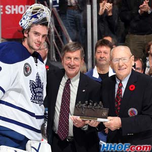 Maple Leafs goaltender Jonas Gustavsson is presented the player of the game award by Hockey Hall of Fame members Johnny Bower and Ted Lindsay at the 2009 Hockey Hall of Fame Game.