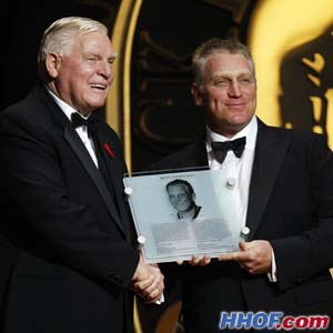 Chairman and Chief Executive Officer of the Hockey Hall of Fame Bill Hay presents 2009 Player Inductee Brett Hull with his Honoured Member plaque. (Dave Sandford/HHOF/Nov.9 2009)