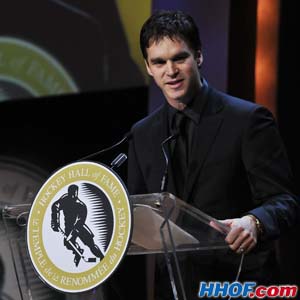 2009 Player Inductee, Luc Robitaille makes his acceptance speech at the 2009 Induction Ceremony. (Matthew Manor/HHOF/Nov.9 2009)