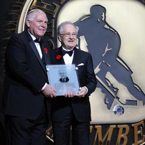 Hockey Hall of Fame Chairman and CEO Bill Hay presents 2010 Inductee Jimmy Devellano with his Honoured Members plaque.