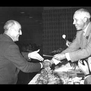 Ivan "Ching" Johnson (left), the Rangers' defensive anchor of the 1920s and 30s, receives his induction plaque from Clarence Campbell in 1959 (Toronto - Turofsky Collection)