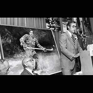 Jean Beliveau is inducted in 1972. The artwork in the background, painted by D. Maggs, can be found today in the Resource Centre at the Hockey Hall of Fame (HHOF/CNE)