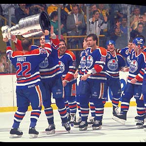 In the inimitable tradition of NHL hockey, Edmonton's Charlie Huddy hands hockey's grandest prize to Kelly Buchberger, as the rest of the Oilers wait their turn to skate the Stanley Cup around the ice on