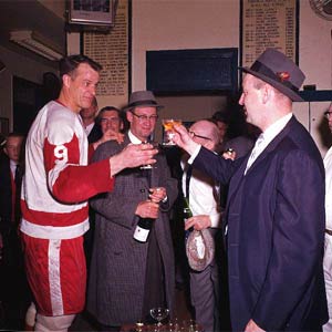 Gentleman Gordie Howe offers his congratulations to Punch Imlach, the coach of the victorious Toronto Maple Leafs, on April 25, 1964 after Toronto edged Howe's Wings four games to three.