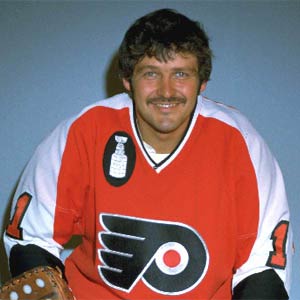 With Hall of Famer Bernie Parent providing superlative netminding, the Philadelphia Flyers won consecutive Stanley Cup titles in 1974 and 1975. The team wore a patch for their official photo shoot to commemorate the honour.