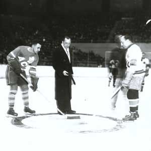 was hit from behind by Boston's Eddie Shore. Honoured Members Joe Primeau (left) and Howie Morenz (right) take the draw.