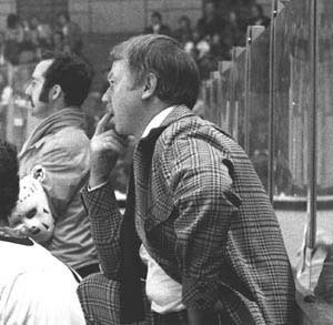 Don Cherry behind the bench of the Springfield Indians