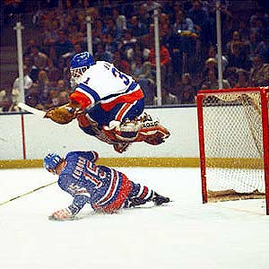 Billy Smith jumps over an inbound Anders Hedberg