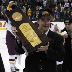 University of Minnesota head coach Don Lucia with the Championship trophy. (Tom Dahlin/Hockey Hall of Fame)