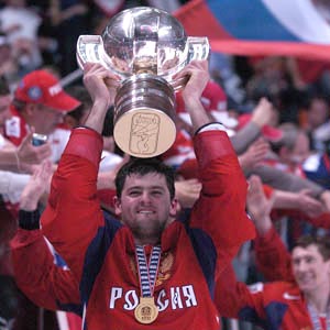 Alexander Radulov of Team Russia proudly hoists the World Championship trophy.