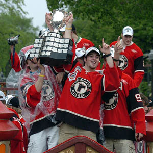 Quebec Remparts players celebrate their 2006 Memorial Cup victory with a parade on the Grande Allee in Quebec City.
