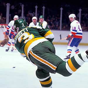 Minnesota North Stars' defenceman Fred Barrett fires a shot