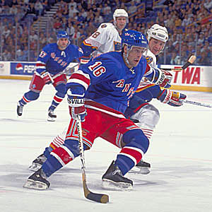Pat LaFontaine of the New York Rangers holds off Al MacInnis of the St. Louis Blues. (David E. Klutho/HHOF)