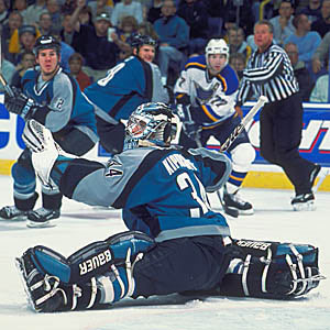 Miikka Kiprussoff of the San Jose Sharks makes a glove save.