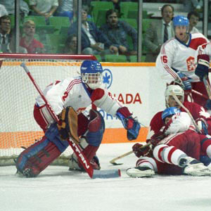 Dominik Hasek of Czechoslovakia hold his ground during Canada Cup action in 1987. (James Lipa/Hockey Hall of Fame)