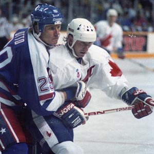 Canada's Wayne Gretzky battles with USA's Joel Otto during Canada Cup action. (James Lipa/Hockey Hall of Fame)