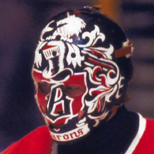 The imposing mask of the Cleveland Barons' Gilles Meloche. (circa mid 1970s)