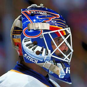 A keyboard theme was painted on Grant Fuhr's mask during his days with the St. Louis Blues. (circa 1995-98)