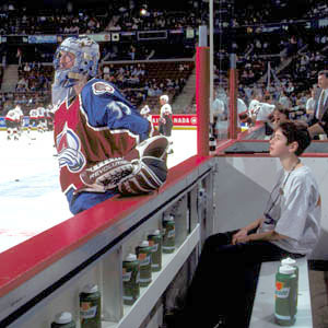 A young fan looks up at Patrick Roy of the Colorado Avalanche. (Ottawa Senators/HHOF)