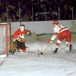 Valeri Kharlamov of the Soviet Union looks to beat Team Canada goalie Tony Esposito. After the first five games of the 1972 series, the Soviets held a winning record of 3-1-1.