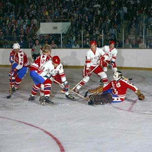 Two years after the 1972 Summit Series, the WHA (the rival league to the NHL) challenged the Soviets to an eight-game tournament. Soviet captain Boris Mikhailov is pictured in front of WHA netminder Gerry Cheevers.