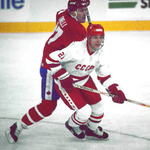 Canada's John Tonelli, the tournament MVP, keeps a close eye on Victor Shalimov of the Soviet Union during Canada Cup action in 1984.
